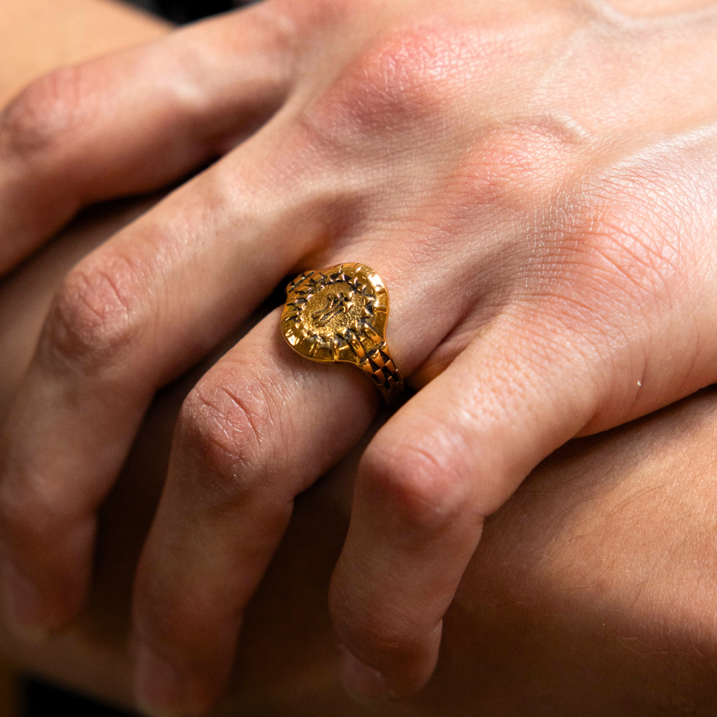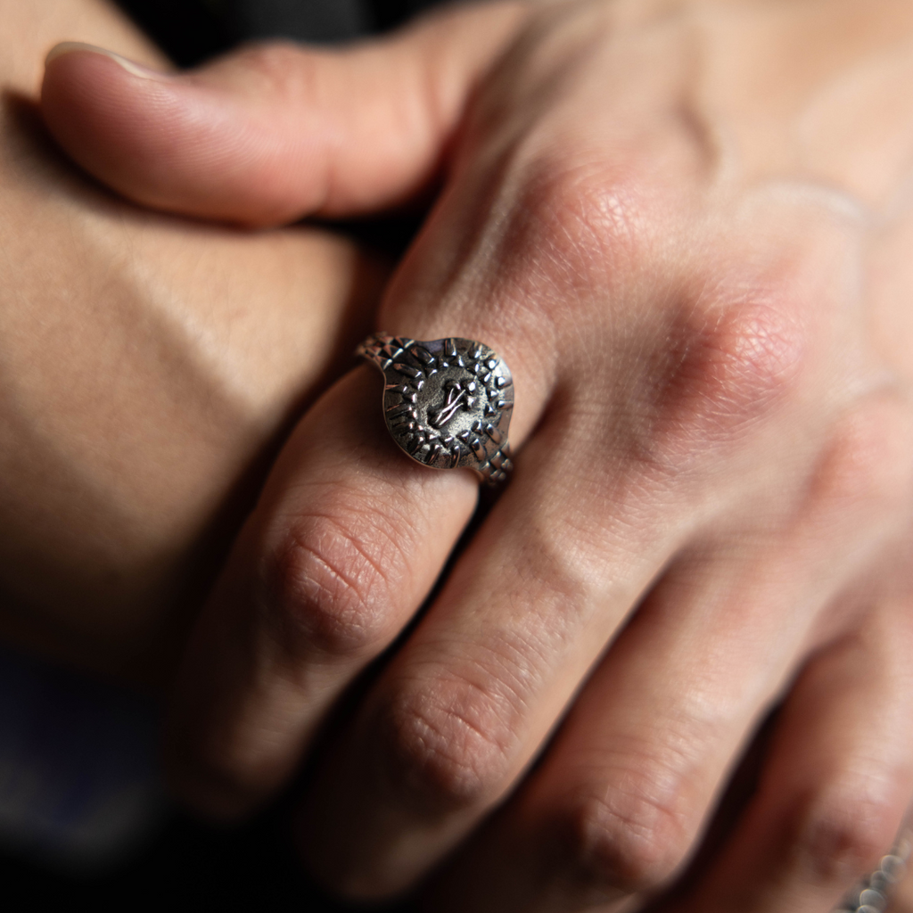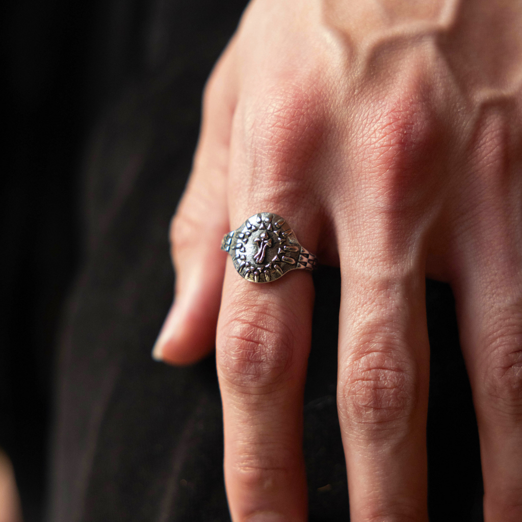 The Psilocybe Bloom Ring is a reimagined version of our original, best-selling Psilocybe Ring—now with refined details. Featuring our signature mushroom logo, inspired by the Psilocybe Mexicana species, this design pays tribute to a mushroom revered for its deep spiritual and cultural significance in Mesoamerican traditions. The ring's burst-textured face radiates outward from the mushroom, symbolizing expansion, growth, and the blooming of inner awareness.
