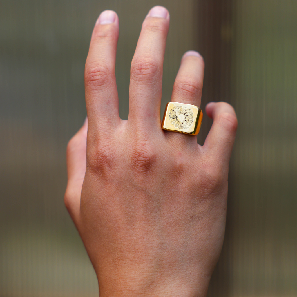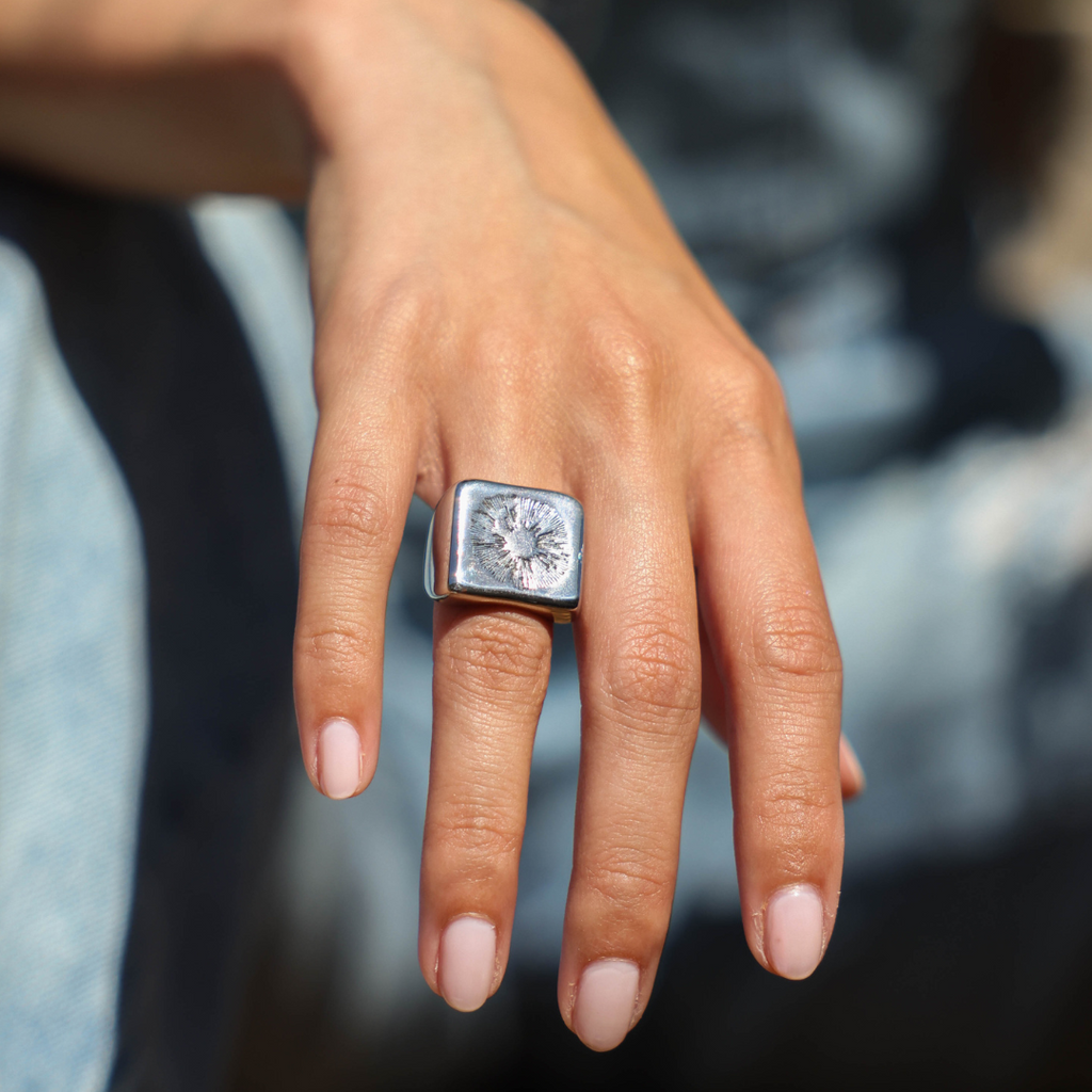 The Spore Ring is an enchanting piece that celebrates the fascinating world of mushroom spores. The ring's face features an intricately engraved mushroom spore print, capturing the delicate beauty of these tiny reproductive units. Mushroom spores are the tiny, dust-like seeds of fungi, responsible for the growth and proliferation of mushroom colonies. These spores are essential in the life cycle of fungi, showcasing the remarkable processes that sustain natural ecosystems.
